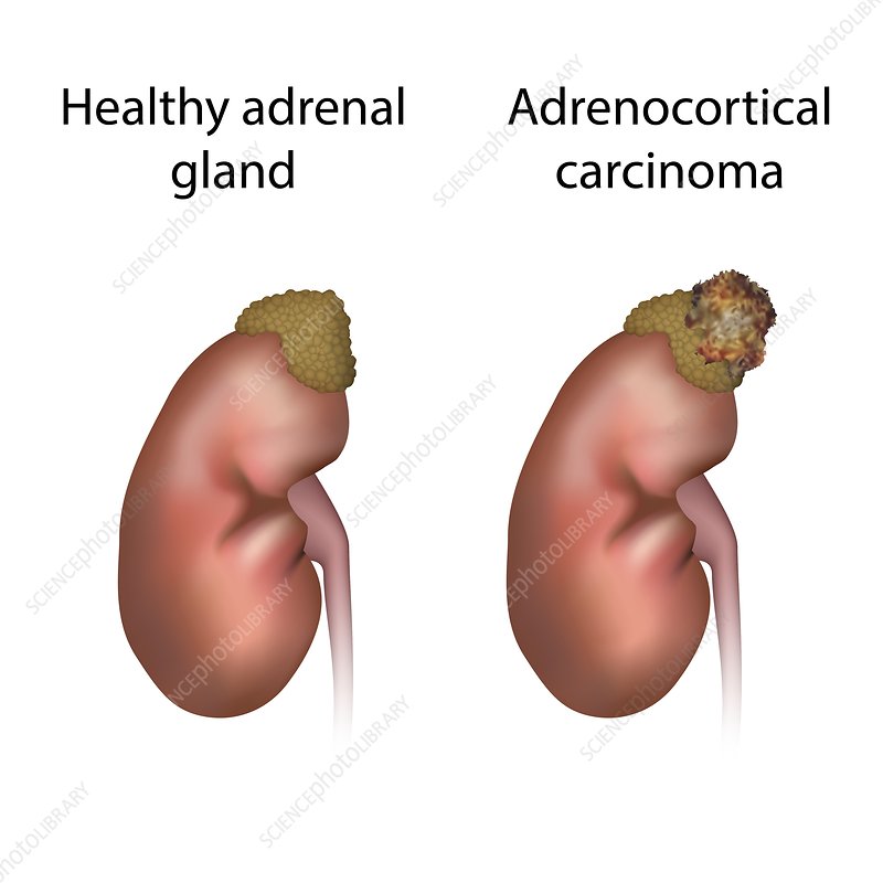 Adrenocortical carcinoma and healthy organ, illustration Adrenocortical carcinoma and healthy adrenal gland, illustration.